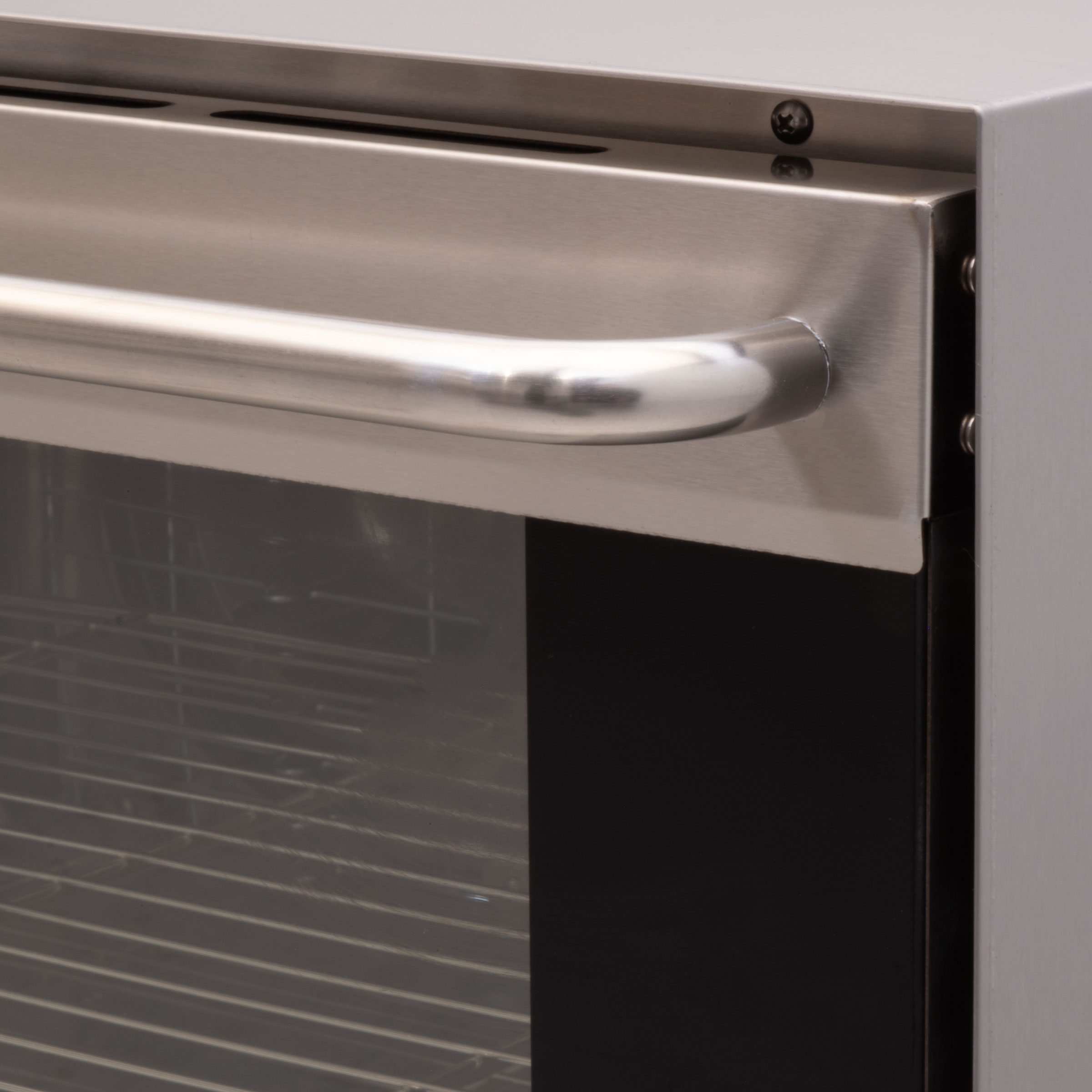 De oven is gebouwd voor dagelijks gebruik: een robuuste RVS behuizing met een nette, hygiënische ovenruimte en heldere binnenverlichting zodat je tijdens service snel kunt checken zonder onnodig warmte te verliezen. De bediening is praktisch en overzichtelijk met een ruime temperatuurinstelling, een timer met eindsignaal én een doorloopstand voor als je continu wilt doorproduceren. Ook is er een veiligheidsschakeling die de motoren stopt wanneer je de deur opent, handig tijdens drukte.