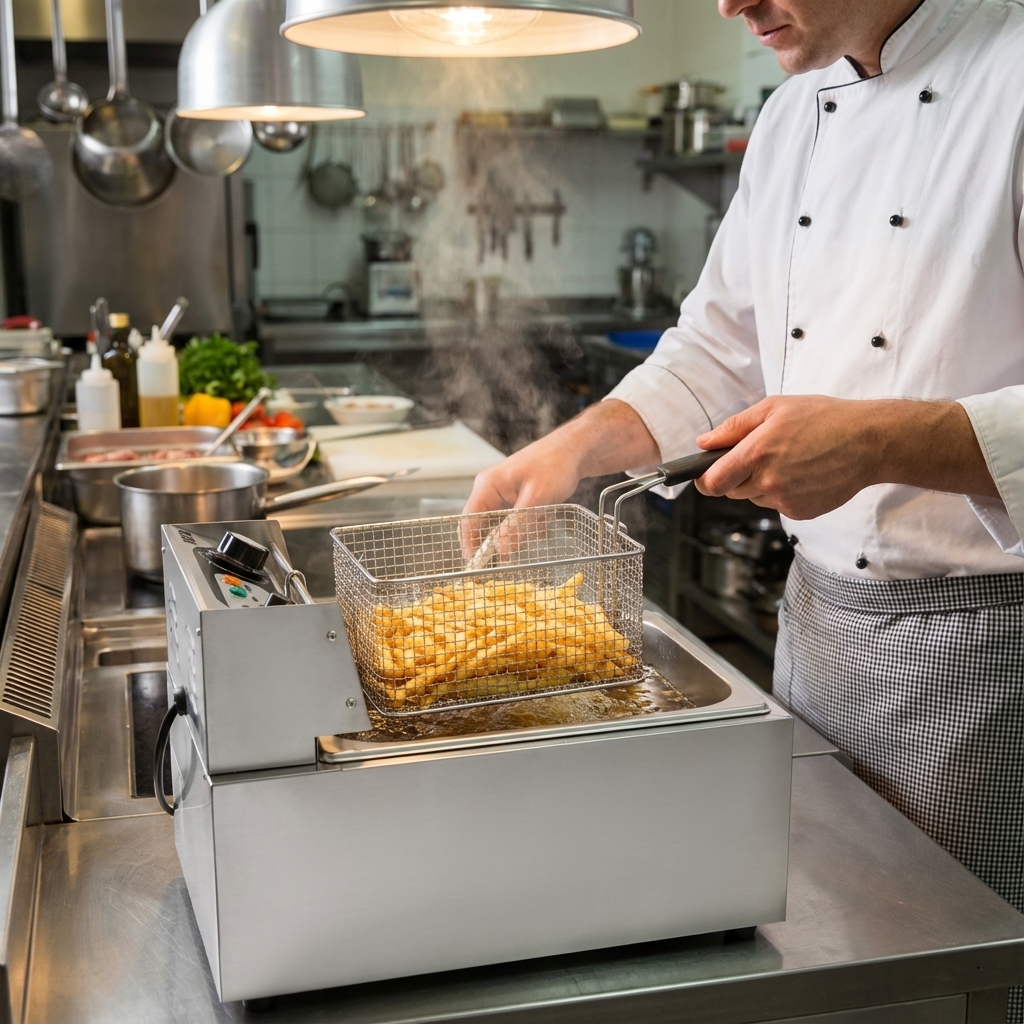 Cette friteuse d’une capacité de 6 litres est parfaite pour la cuisine professionnelle. Elle est idéale pour frire de petites quantités à la fois, mais sa qualité ne compromet pas sa taille. La friteuse est parfaite pour frire différents types d’aliments tels que des frites fraîches, des légumes, des snacks. Le nettoyage est facile. En effet, toutes les pièces sont faciles à démonter et à nettoyer car tout est en acier inoxydable.
