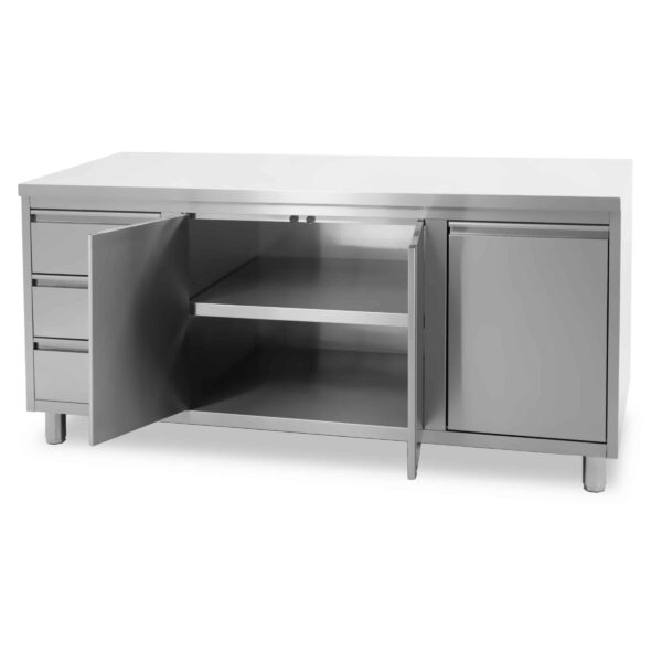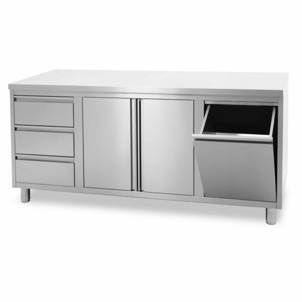 HCB Armoire de travail – porte pliante – 3 tiroirs – poubelle – 180 cm – inox