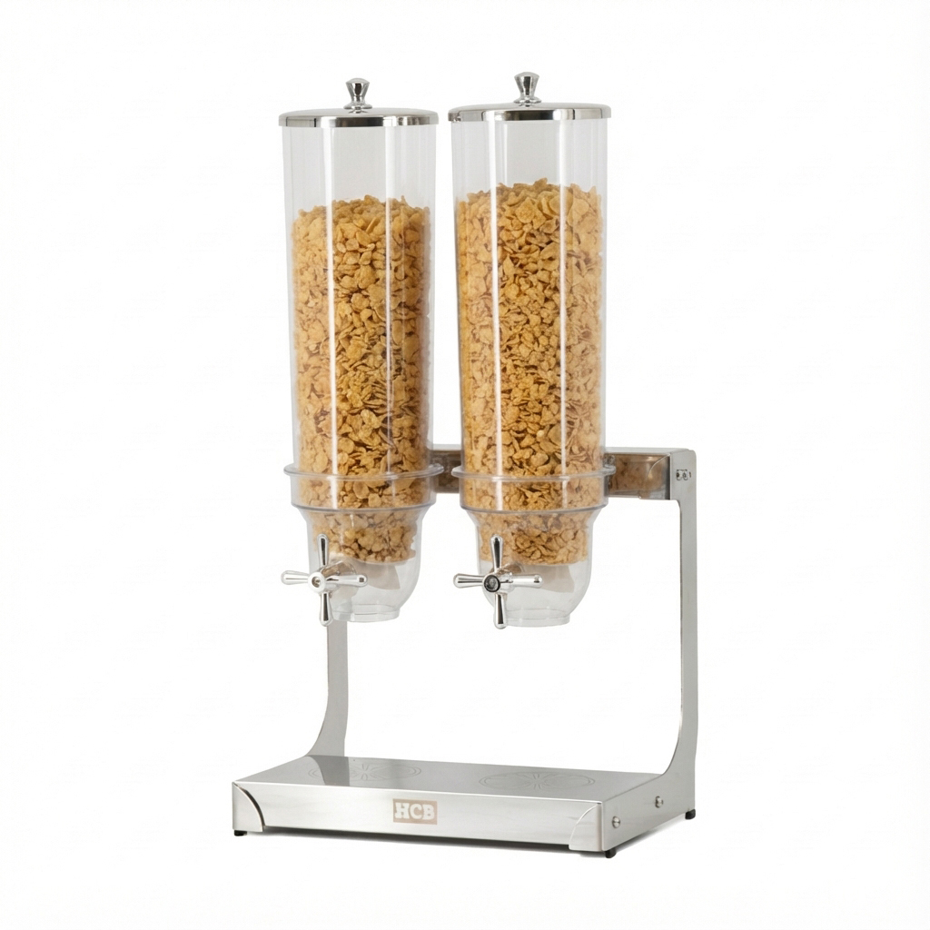 Le distributeur de céréales en acier inoxydable HCB de 2 x 3,5 litres est la solution pour une présentation élégante et hygiénique des céréales, du muesli ou des fruits secs pour le petit-déjeuner dans les buffets ou les points de vente en libre-service dans le secteur de la restauration. Grâce à son réservoir résistant aux rayures et à sa construction robuste en acier inoxydable, ce distributeur est parfait pour une utilisation quotidienne intensive. Il confère également un aspect luxueux au petit-déjeuner à la maison ou à un buffet de brunch festif.