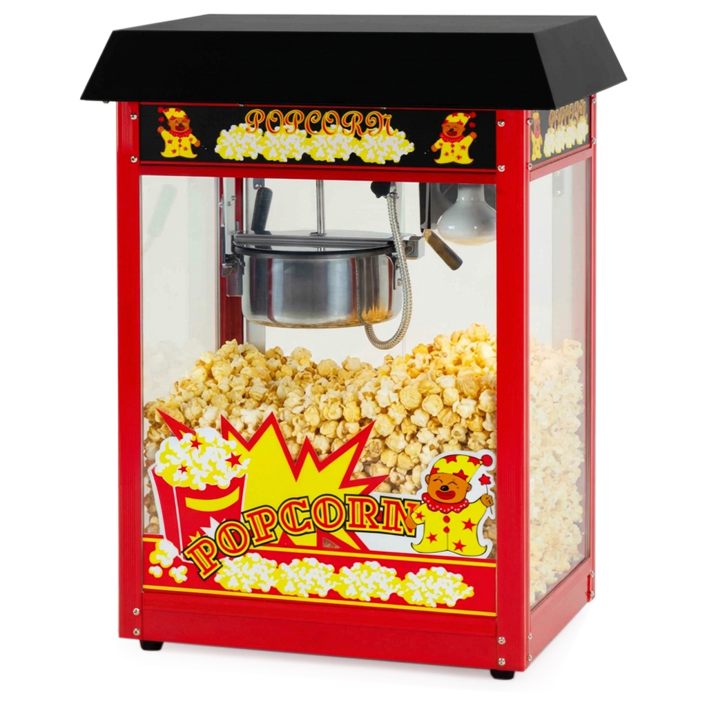 Machine à pop-corn professionnelle, économe en énergie et sûre. Châssis en alliage d’aluminium, boîtier robuste en verre trempé et acier peint par poudrage en rouge. Le bac à pop-corn est équipé d’un agitateur et se vide facilement grâce à une pince. Le côté service est doté d’une trappe pratique pour ramasser le pop-corn, ainsi que d’une grande porte pivotante en verre acrylique. La chambre est éclairée pour présenter magnifiquement le pop-corn fraîchement éclaté. Le bac à miettes situé sous le meuble permet de retirer facilement les grains non éclatés et les miettes. Il faut environ 2 minutes pour préparer une fournée de pop-corn.
