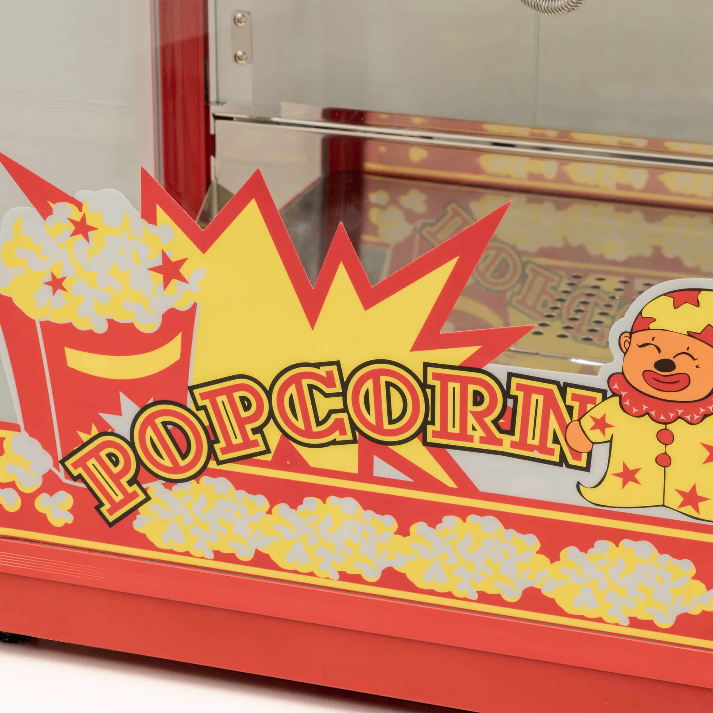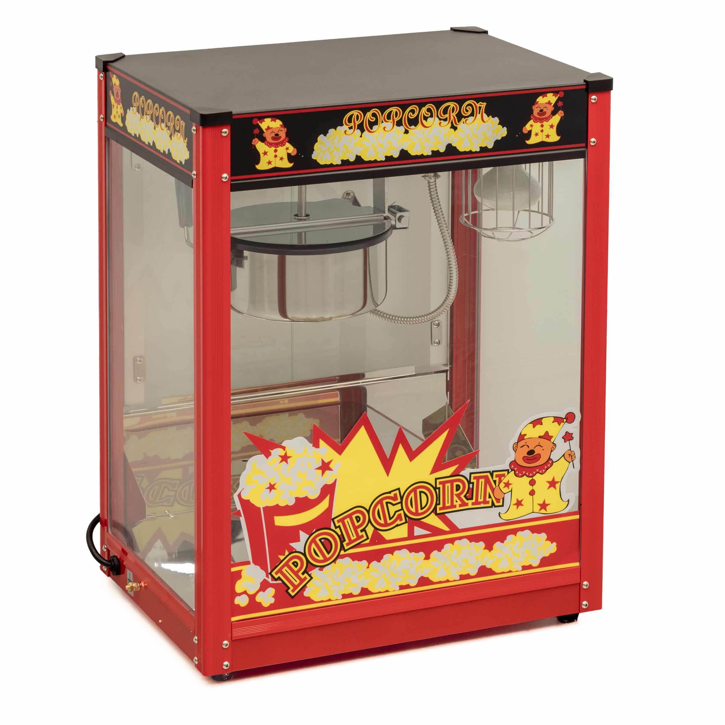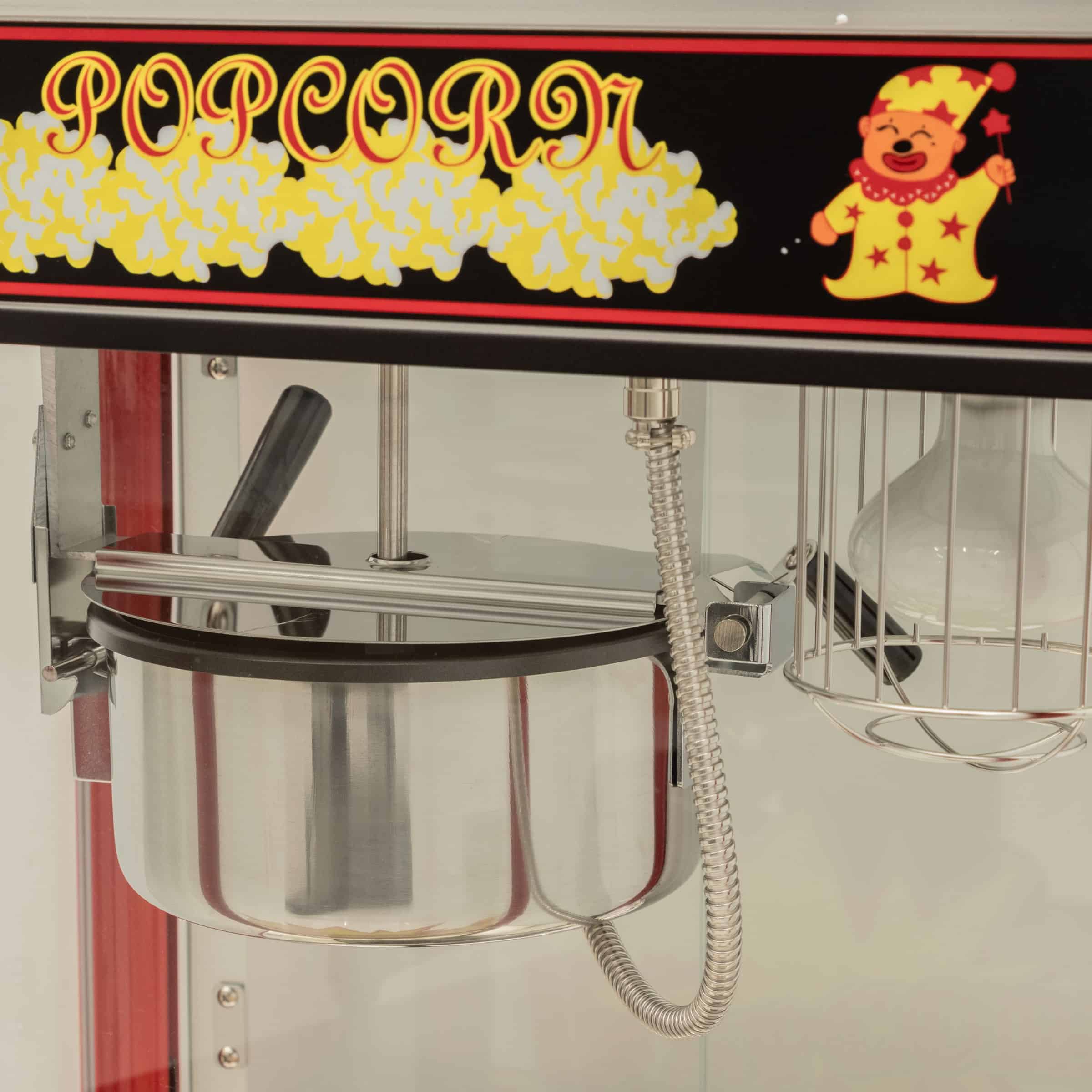Machine à pop-corn professionnelle, économe en énergie et sûre. Châssis en alliage d’aluminium, boîtier robuste en verre trempé et acier peint par poudrage en rouge. Le bac à pop-corn est équipé d’un agitateur et se vide facilement grâce à une pince. Le côté service est doté d’une trappe pratique pour ramasser le pop-corn, ainsi que d’une grande porte pivotante en verre acrylique. La chambre est éclairée pour présenter magnifiquement le pop-corn fraîchement éclaté. Le bac à miettes situé sous le meuble permet de retirer facilement les grains non éclatés et les miettes. Il faut environ 2 minutes pour préparer une fournée de pop-corn.