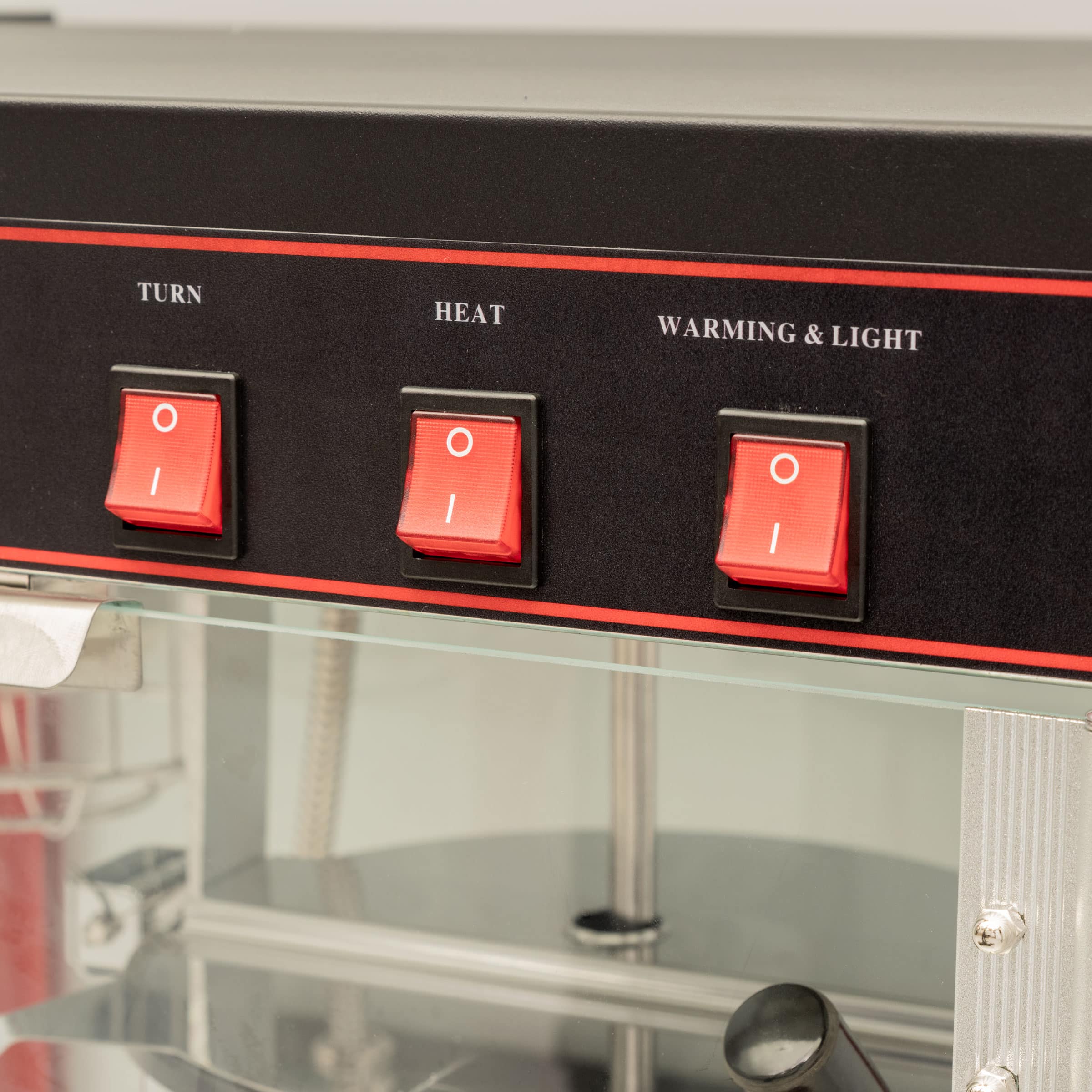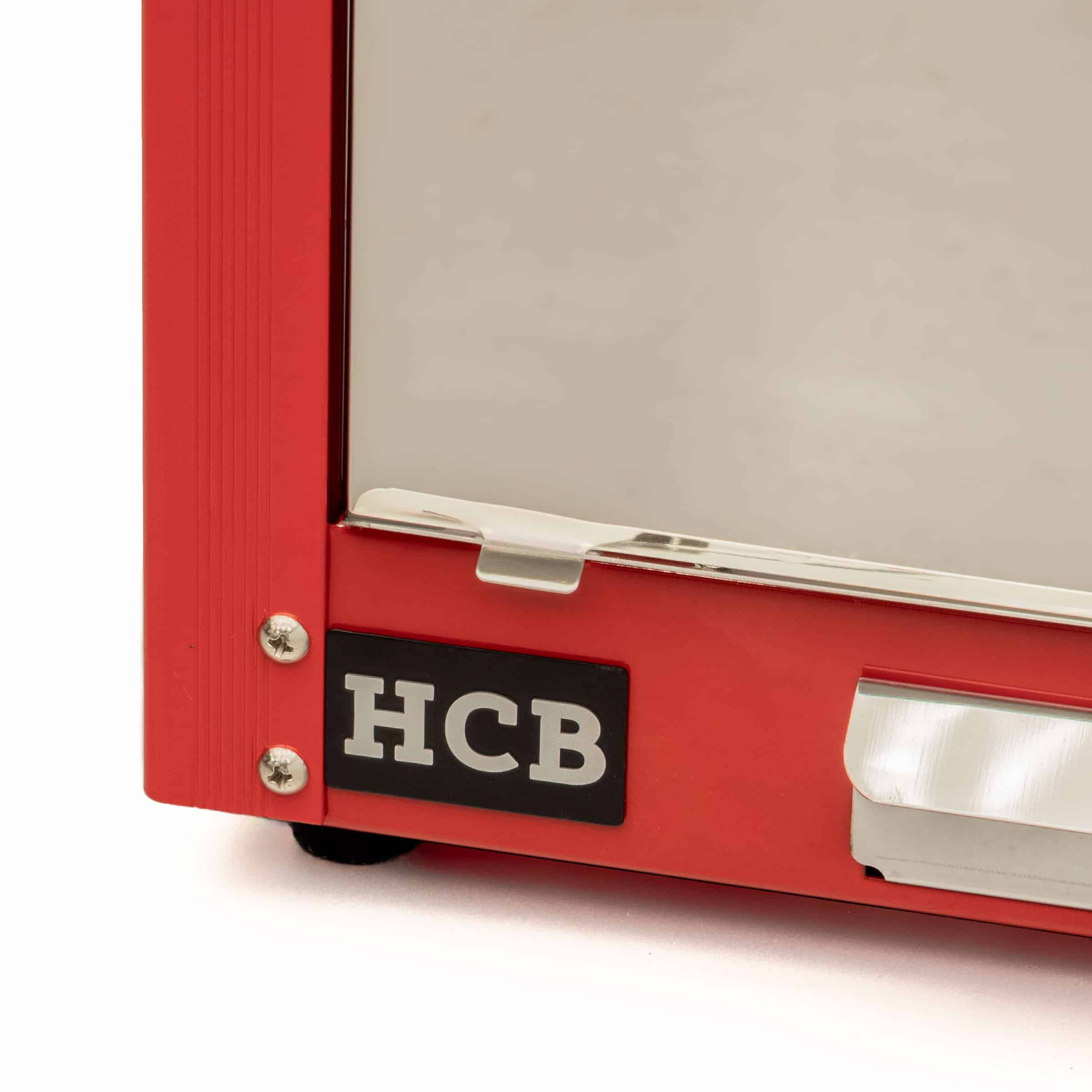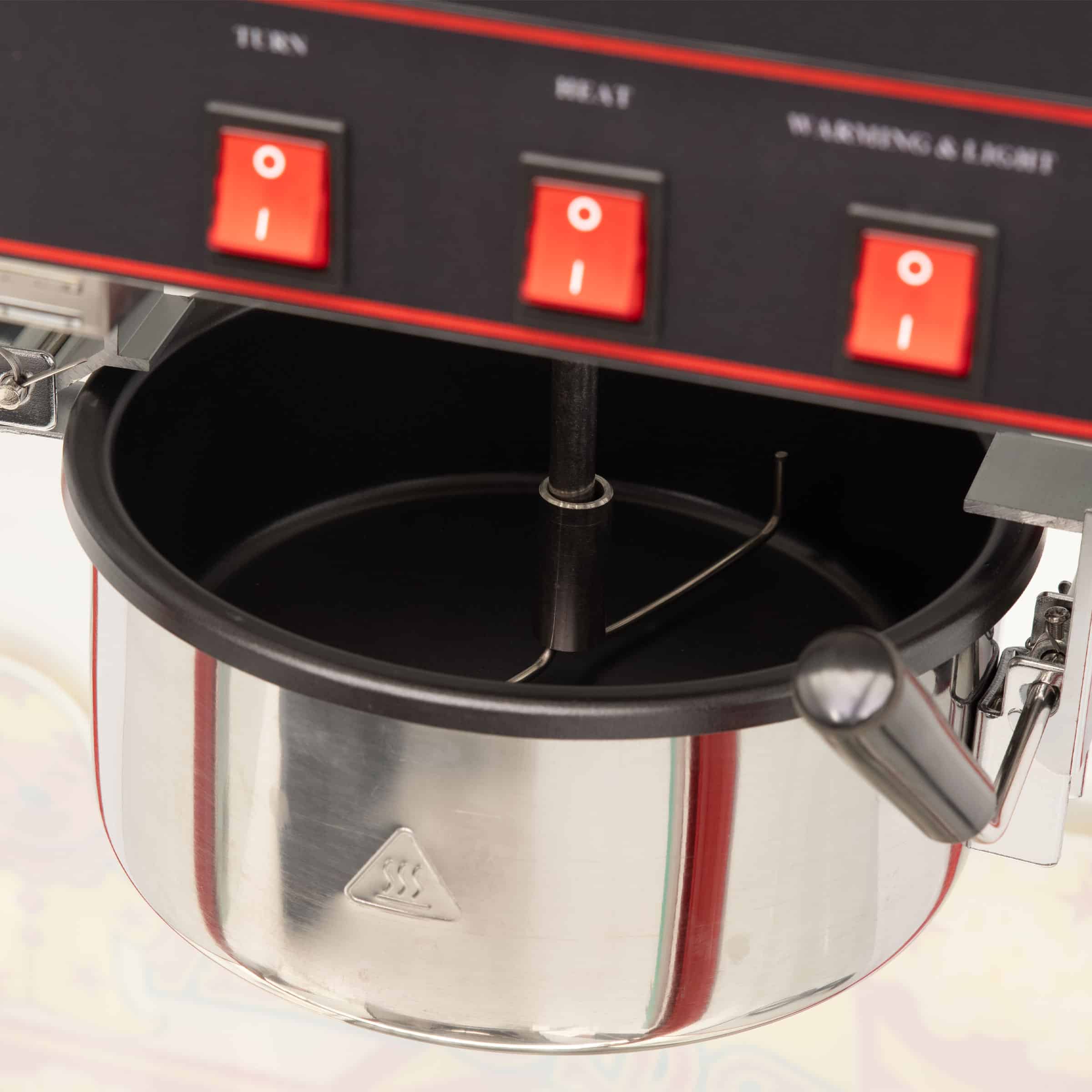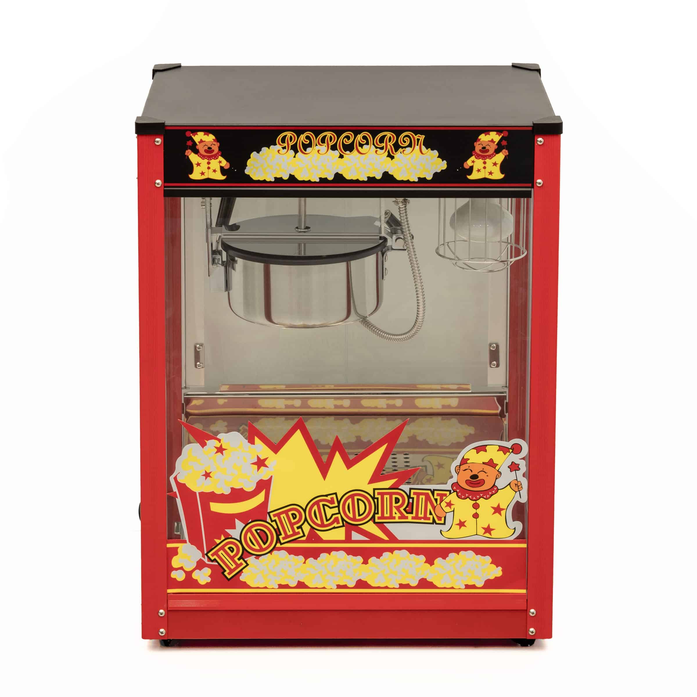 Machine à pop-corn professionnelle, économe en énergie et sûre. Châssis en alliage d’aluminium, boîtier robuste en verre trempé et acier peint par poudrage en rouge. Le bac à pop-corn est équipé d’un agitateur et se vide facilement grâce à une pince. Le côté service est doté d’une trappe pratique pour ramasser le pop-corn, ainsi que d’une grande porte pivotante en verre acrylique. La chambre est éclairée pour présenter magnifiquement le pop-corn fraîchement éclaté. Le bac à miettes situé sous le meuble permet de retirer facilement les grains non éclatés et les miettes. Il faut environ 2 minutes pour préparer une fournée de pop-corn.