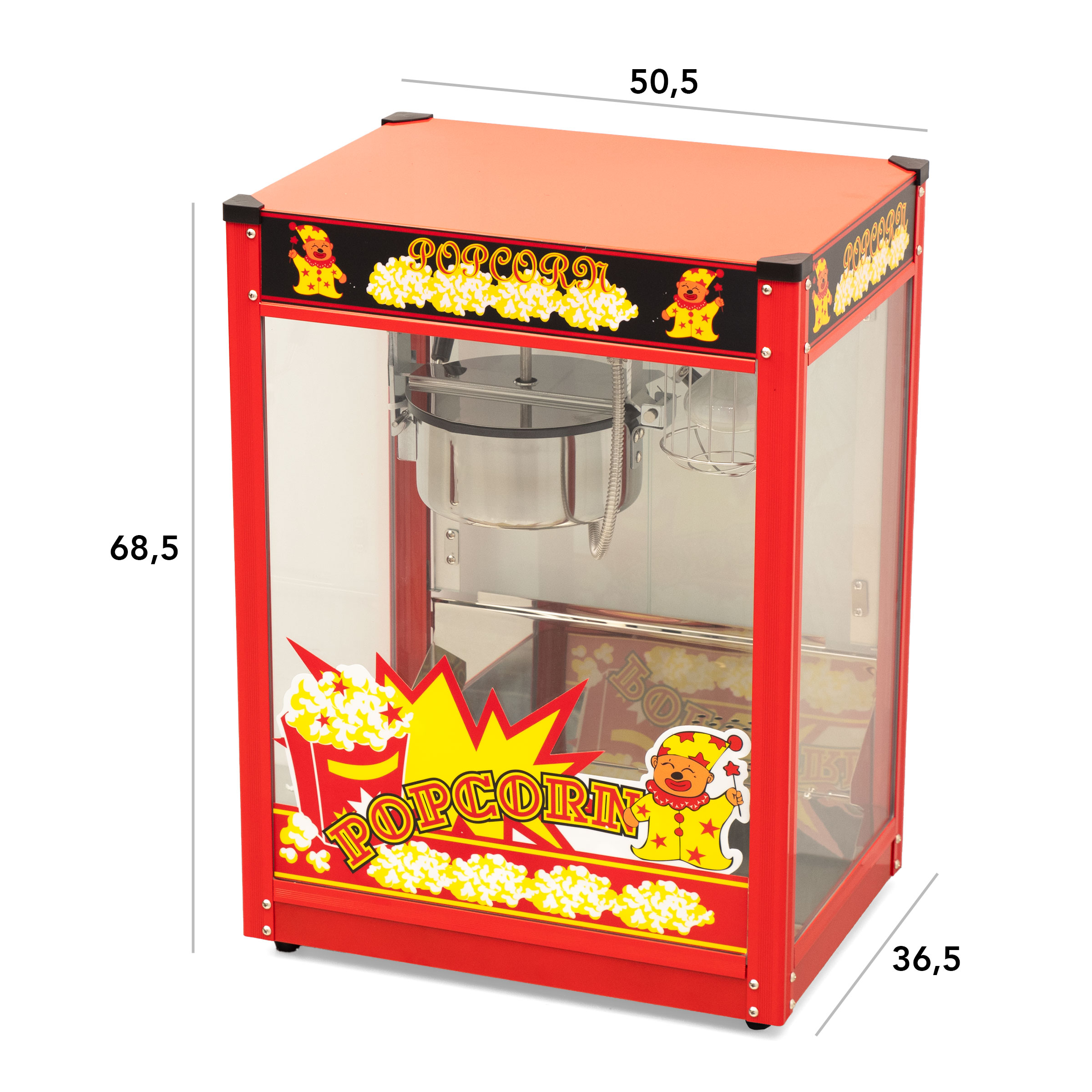 Machine à pop-corn professionnelle, économe en énergie et sûre. Châssis en alliage d’aluminium, boîtier robuste en verre trempé et acier peint par poudrage en rouge. Le bac à pop-corn est équipé d’un agitateur et se vide facilement grâce à une pince. Le côté service est doté d’une trappe pratique pour ramasser le pop-corn, ainsi que d’une grande porte pivotante en verre acrylique. La chambre est éclairée pour présenter magnifiquement le pop-corn fraîchement éclaté. Le bac à miettes situé sous le meuble permet de retirer facilement les grains non éclatés et les miettes. Il faut environ 2 minutes pour préparer une fournée de pop-corn.